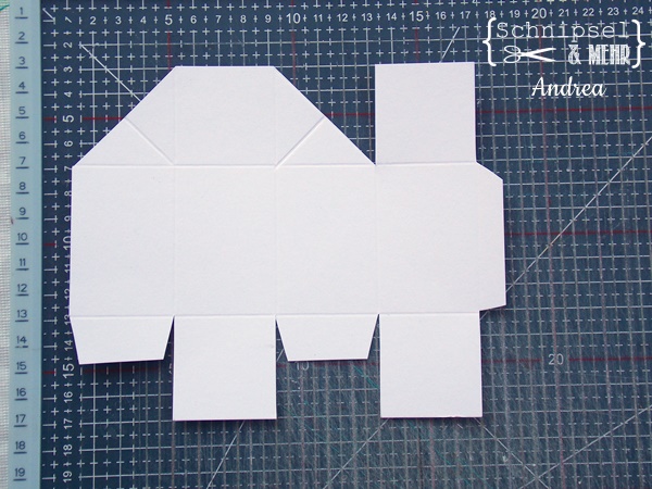Falzt den Cardstock der Länge nach bei 4-8-12-16-17 und auf der kurzen Seite bei 4-10-14. Schneidet und falzt dann das Papier wie auf dem Foto abgebildet zu.