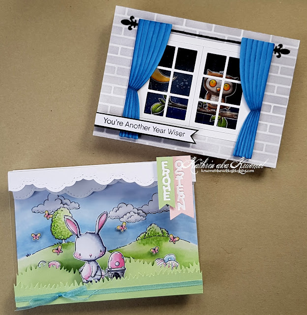 Bei dieser ist das Motiv nach hinten versetzt und befindet sich gerade in der Karte. Die Grundkarte habe ich hier aus einem 15 x 28 cm großen Stück Cardstock gestaltet. Die lange Seite ist bei 1 cm, 2,5 cm, 4 cm, 14,5 cm, 16 cm und 17,5 cm gefalzt. Aus einem der 10,5 cm hohen Bereichen habe ich ein Rechteck ausgestanzt und auch dieses von hinten mit Folie abgedeckt. Das wäre hier nicht unbedingt nötig, passte aber bei meinem Fenster ganz gut. Außerdem gibt es der Karte mehr Stabilität. Von oben auf die Folie habe ich dann ein gestanztes Fenster geklebt.